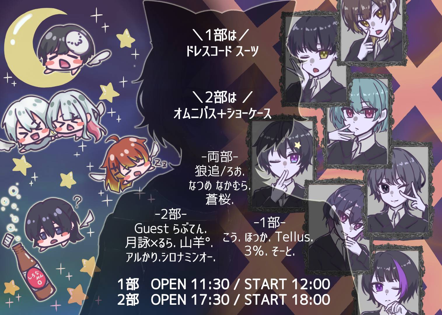 出演者 狼追/ろお 蒼桜️ なつめ️ なかむら 月詠×るら️ 山羊゜️ シロナミンオー️ アルかり️ らぶてん(GUEST) OPEN 未定 / START 未定 Sチケット¥3,900+Drink(¥600-) / 通常¥2,400+Drink(¥600-)